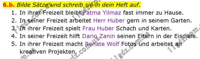 Bilde Sätze und schreib sie in dein Heft auf. 1. In ihrer Freizeit bleibt Fatma Yilmaz fast immer zu Hause. 2. In seiner Freizeit arbeitet Herr Huber gern in seinem Garten. 3. In ihrer Freizeit spielt Frau Huber Schach und Karten. 4. In seiner Freizeit hilft Dario Zanin seinen Eltern in der Eisdiele. 5. In ihrer Freizeit macht Renate Wolf Fotos und arbeitet an kreativen Projekten.