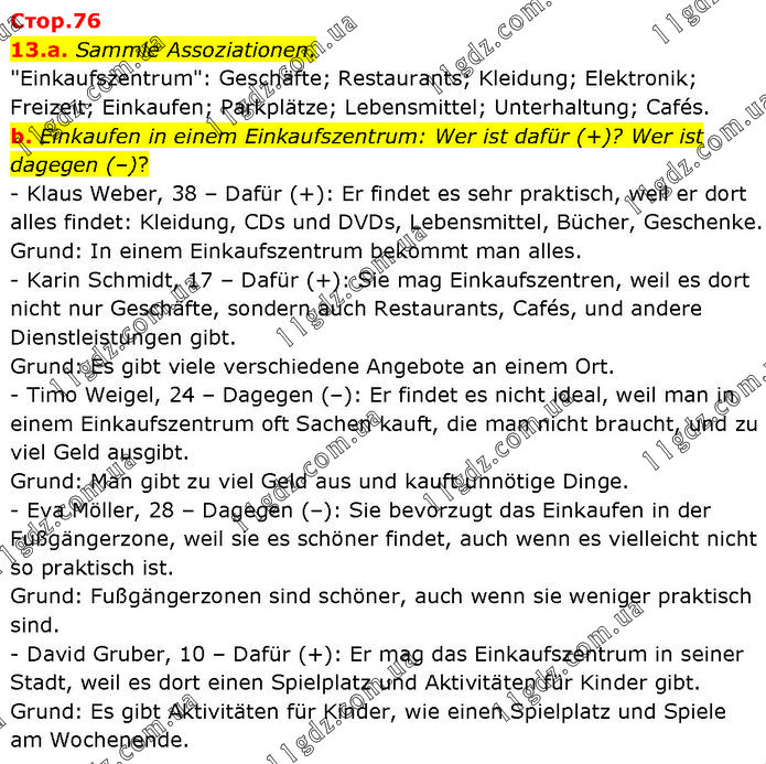 a. Sammle Assoziationen. "Einkaufszentrum": Geschäfte; Restaurants; Kleidung; Elektronik; Freizeit; Einkaufen; Parkplätze; Lebensmittel; Unterhaltung; Cafés. b. Einkaufen in einem Einkaufszentrum: Wer ist dafür (+)? Wer ist dagegen (–)? - Klaus Weber, 38 – Dafür (+): Er findet es sehr praktisch, weil er dort alles findet: Kleidung, CDs und DVDs, Lebensmittel, Bücher, Geschenke. Grund: In einem Einkaufszentrum bekommt man alles. - Karin Schmidt, 17 – Dafür (+): Sie mag Einkaufszentren, weil es dort nicht nur Geschäfte, sondern auch Restaurants, Cafés, und andere Dienstleistungen gibt. Grund: Es gibt viele verschiedene Angebote an einem Ort. - Timo Weigel, 24 – Dagegen (–): Er findet es nicht ideal, weil man in einem Einkaufszentrum oft Sachen kauft, die man nicht braucht, und zu viel Geld ausgibt. Grund: Man gibt zu viel Geld aus und kauft unnötige Dinge. - Eva Möller, 28 – Dagegen (–): Sie bevorzugt das Einkaufen in der Fußgängerzone, weil sie es schöner findet, auch wenn es vielleicht nicht so praktisch ist. Grund: Fußgängerzonen sind schöner, auch wenn sie weniger praktisch sind. - David Gruber, 10 – Dafür (+): Er mag das Einkaufszentrum in seiner Stadt, weil es dort einen Spielplatz und Aktivitäten für Kinder gibt. Grund: Es gibt Aktivitäten für Kinder, wie einen Spielplatz und Spiele am Wochenende.