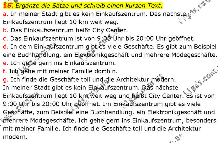 Ergänze die Sätze und schreib einen kurzen Text. a. In meiner Stadt gibt es kein Einkaufszentrum. Das nächste Einkaufszentrum liegt 10 km weit weg. b. Das Einkaufszentrum heißt City Center. c. Das Einkaufszentrum ist von 9:00 Uhr bis 20:00 Uhr geöffnet. d. In dem Einkaufszentrum gibt es viele Geschäfte. Es gibt zum Beispiel eine Buchhandlung, ein Elektronikgeschäft und mehrere Modegeschäfte. e. Ich gehe gern ins Einkaufszentrum. f. Ich gehe mit meiner Familie dorthin. g. Ich finde die Geschäfte toll und die Architektur modern. In meiner Stadt gibt es kein Einkaufszentrum. Das nächste Einkaufszentrum liegt 10 km weit weg und heißt City Center. Es ist von 9:00 Uhr bis 20:00 Uhr geöffnet. Im Einkaufszentrum gibt es viele Geschäfte, zum Beispiel eine Buchhandlung, ein Elektronikgeschäft und mehrere Modegeschäfte. Ich gehe gern ins Einkaufszentrum, besonders mit meiner Familie. Ich finde die Geschäfte toll und die Architektur modern.
