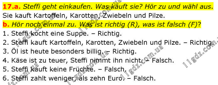a. Steffi geht einkaufen. Was kauft sie? Hör zu und wähl aus. Sie kauft Kartoffeln, Karotten, Zwiebeln und Pilze. b. Hör noch einmal zu. Was ist richtig (R), was ist falsch (F)? 1. Steffi kocht eine Suppe. – Richtig. 2. Steffi kauft Kartoffeln, Karotten, Zwiebeln und Pilze. – Richtig. 3. Öl ist heute besonders billig. – Richtig. 4. Käse ist zu teuer, Steffi nimmt ihn nicht. – Falsch. 5. Steffi kauft keine Früchte. – Falsch. 6. Steffi zahlt weniger, als zehn Euro. – Falsch.