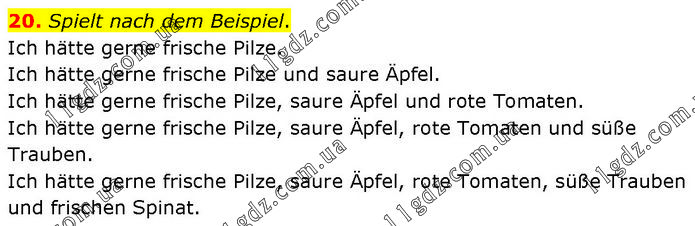 Spielt nach dem Beispiel. Ich hätte gerne frische Pilze. Ich hätte gerne frische Pilze und saure Äpfel. Ich hätte gerne frische Pilze, saure Äpfel und rote Tomaten. Ich hätte gerne frische Pilze, saure Äpfel, rote Tomaten und süße Trauben. Ich hätte gerne frische Pilze, saure Äpfel, rote Tomaten, süße Trauben und frischen Spinat.