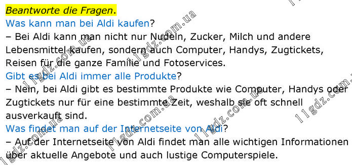 Beantworte die Fragen. Was kann man bei Aldi kaufen? – Bei Aldi kann man nicht nur Nudeln, Zucker, Milch und andere Lebensmittel kaufen, sondern auch Computer, Handys, Zugtickets, Reisen für die ganze Familie und Fotoservices. Gibt es bei Aldi immer alle Produkte? – Nein, bei Aldi gibt es bestimmte Produkte wie Computer, Handys oder Zugtickets nur für eine bestimmte Zeit, weshalb sie oft schnell ausverkauft sind. Was findet man auf der Internetseite von Aldi? – Auf der Internetseite von Aldi findet man alle wichtigen Informationen über aktuelle Angebote und auch lustige Computerspiele.