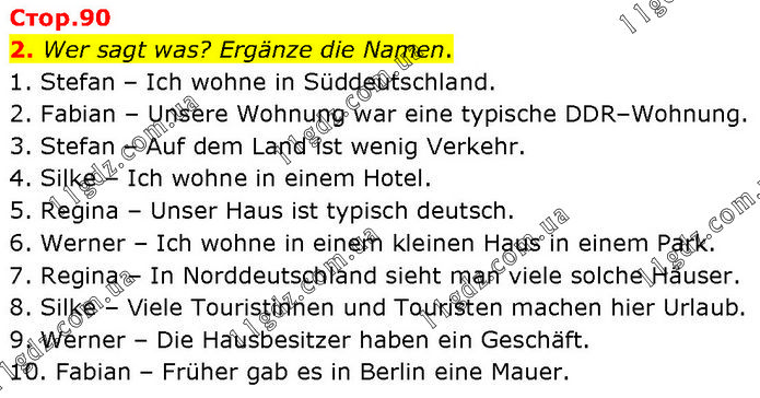 Wer sagt was? Ergänze die Namen. 1. Stefan – Ich wohne in Süddeutschland. 2. Fabian – Unsere Wohnung war eine typische DDR–Wohnung. 3. Stefan – Auf dem Land ist wenig Verkehr. 4. Silke – Ich wohne in einem Hotel. 5. Regina – Unser Haus ist typisch deutsch. 6. Werner – Ich wohne in einem kleinen Haus in einem Park. 7. Regina – In Norddeutschland sieht man viele solche Häuser. 8. Silke – Viele Touristinnen und Touristen machen hier Urlaub. 9. Werner – Die Hausbesitzer haben ein Geschäft. 10. Fabian – Früher gab es in Berlin eine Mauer.