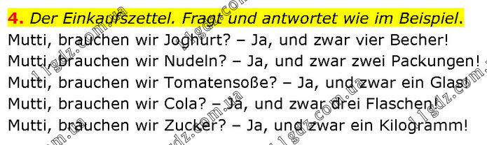 Der Einkaufszettel. Fragt und antwortet wie im Beispiel. Mutti, brauchen wir Joghurt? – Ja, und zwar vier Becher! Mutti, brauchen wir Nudeln? – Ja, und zwar zwei Packungen! Mutti, brauchen wir Tomatensoße? – Ja, und zwar ein Glas! Mutti, brauchen wir Cola? – Ja, und zwar drei Flaschen! Mutti, brauchen wir Zucker? – Ja, und zwar ein Kilogramm!