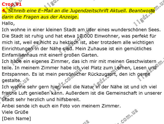 Schreib eine E–Mail an die Jugendzeitschrift Aktuell. Beantworte darin die Fragen aus der Anzeige. Hallo, Ich wohne in einer kleinen Stadt am Ufer eines wunderschönen Sees. Die Stadt ist ruhig und hat etwa 10.000 Einwohner, was perfekt für mich ist, weil es nicht zu hektisch ist, aber trotzdem alle wichtigen Einrichtungen in der Nähe sind. Mein Zuhause ist ein gemütliches Einfamilienhaus mit einem großen Garten. Ich habe ein eigenes Zimmer, das ich mir mit meinen Geschwistern teile. In meinem Zimmer habe ich viel Platz zum Lernen, Lesen und Entspannen. Es ist mein persönlicher Rückzugsort, den ich gerne gestalte. Ich wohne sehr gern hier, weil die Natur in der Nähe ist und ich viel frische Luft genießen kann. Außerdem ist die Gemeinschaft in unserer Stadt sehr herzlich und hilfsbereit. Anbei sende ich euch ein Foto von meinem Zimmer. Viele Grüße [Dein Name]