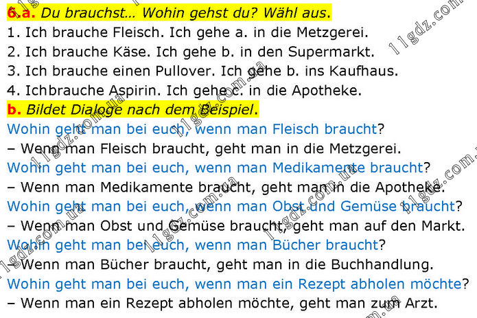 a. Du brauchst… Wohin gehst du? Wähl aus. 1. Ich brauche Fleisch. Ich gehe a. in die Metzgerei. 2. Ich brauche Käse. Ich gehe b. in den Supermarkt. 3. Ich brauche einen Pullover. Ich gehe b. ins Kaufhaus. 4. Ich brauche Aspirin. Ich gehe c. in die Apotheke. b. Bildet Dialoge nach dem Beispiel. Wohin geht man bei euch, wenn man Fleisch braucht? – Wenn man Fleisch braucht, geht man in die Metzgerei. Wohin geht man bei euch, wenn man Medikamente braucht? – Wenn man Medikamente braucht, geht man in die Apotheke. Wohin geht man bei euch, wenn man Obst und Gemüse braucht? – Wenn man Obst und Gemüse braucht, geht man auf den Markt. Wohin geht man bei euch, wenn man Bücher braucht? – Wenn man Bücher braucht, geht man in die Buchhandlung. Wohin geht man bei euch, wenn man ein Rezept abholen möchte? – Wenn man ein Rezept abholen möchte, geht man zum Arzt.