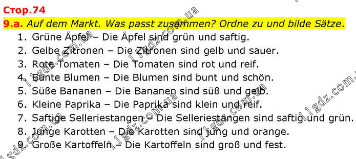 a. Auf dem Markt. Was passt zusammen? Ordne zu und bilde Sätze. 1. Grüne Äpfel – Die Äpfel sind grün und saftig. 2. Gelbe Zitronen – Die Zitronen sind gelb und sauer. 3. Rote Tomaten – Die Tomaten sind rot und reif. 4. Bunte Blumen – Die Blumen sind bunt und schön. 5. Süße Bananen – Die Bananen sind süß und gelb. 6. Kleine Paprika – Die Paprika sind klein und reif. 7. Saftige Selleriestangen – Die Selleriestangen sind saftig und grün. 8. Junge Karotten – Die Karotten sind jung und orange. 9. Große Kartoffeln – Die Kartoffeln sind groß und fest.