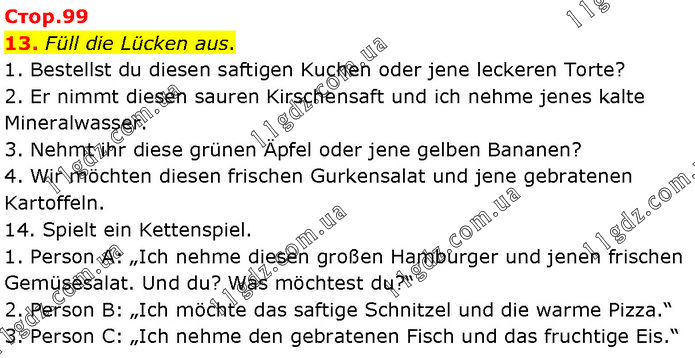 Füll die Lücken aus. 1. Bestellst du diesen saftigen Kuchen oder jene leckeren Torte? 2. Er nimmt diesen sauren Kirschensaft und ich nehme jenes kalte Mineralwasser. 3. Nehmt ihr diese grünen Äpfel oder jene gelben Bananen? 4. Wir möchten diesen frischen Gurkensalat und jene gebratenen Kartoffeln. 14. Spielt ein Kettenspiel. 1. Person A: „Ich nehme diesen großen Hamburger und jenen frischen Gemüsesalat. Und du? Was möchtest du?“ 2. Person B: „Ich möchte das saftige Schnitzel und die warme Pizza.“ 3. Person C: „Ich nehme den gebratenen Fisch und das fruchtige Eis.“