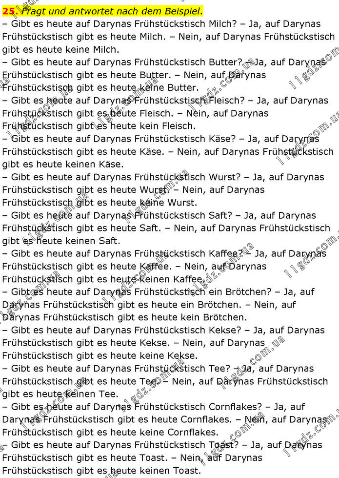 Fragt und antwortet nach dem Beispiel. – Gibt es heute auf Darynas Frühstückstisch Milch? – Ja, auf Darynas Frühstückstisch gibt es heute Milch. – Nein, auf Darynas Frühstückstisch gibt es heute keine Milch. – Gibt es heute auf Darynas Frühstückstisch Butter? – Ja, auf Darynas Frühstückstisch gibt es heute Butter. – Nein, auf Darynas Frühstückstisch gibt es heute keine Butter. – Gibt es heute auf Darynas Frühstückstisch Fleisch? – Ja, auf Darynas Frühstückstisch gibt es heute Fleisch. – Nein, auf Darynas Frühstückstisch gibt es heute kein Fleisch. – Gibt es heute auf Darynas Frühstückstisch Käse? – Ja, auf Darynas Frühstückstisch gibt es heute Käse. – Nein, auf Darynas Frühstückstisch gibt es heute keinen Käse. – Gibt es heute auf Darynas Frühstückstisch Wurst? – Ja, auf Darynas Frühstückstisch gibt es heute Wurst. – Nein, auf Darynas Frühstückstisch gibt es heute keine Wurst. – Gibt es heute auf Darynas Frühstückstisch Saft? – Ja, auf Darynas Frühstückstisch gibt es heute Saft. – Nein, auf Darynas Frühstückstisch gibt es heute keinen Saft. – Gibt es heute auf Darynas Frühstückstisch Kaffee? – Ja, auf Darynas Frühstückstisch gibt es heute Kaffee. – Nein, auf Darynas Frühstückstisch gibt es heute keinen Kaffee. – Gibt es heute auf Darynas Frühstückstisch ein Brötchen? – Ja, auf Darynas Frühstückstisch gibt es heute ein Brötchen. – Nein, auf Darynas Frühstückstisch gibt es heute kein Brötchen. – Gibt es heute auf Darynas Frühstückstisch Kekse? – Ja, auf Darynas Frühstückstisch gibt es heute Kekse. – Nein, auf Darynas Frühstückstisch gibt es heute keine Kekse. – Gibt es heute auf Darynas Frühstückstisch Tee? – Ja, auf Darynas Frühstückstisch gibt es heute Tee. – Nein, auf Darynas Frühstückstisch gibt es heute keinen Tee. – Gibt es heute auf Darynas Frühstückstisch Cornflakes? – Ja, auf Darynas Frühstückstisch gibt es heute Cornflakes. – Nein, auf Darynas Frühstückstisch gibt es heute keine Cornflakes. – Gibt es heute auf Darynas Frühstückstisch Toast? – Ja, auf Darynas Frühstückstisch gibt es heute Toast. – Nein, auf Darynas Frühstückstisch gibt es heute keinen Toast.