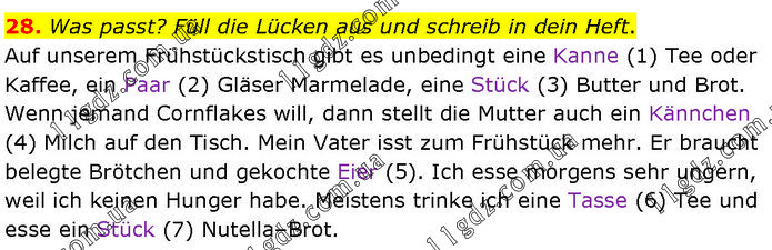 Was passt? Füll die Lücken aus und schreib in dein Heft. Auf unserem Frühstückstisch gibt es unbedingt eine Kanne (1) Tee oder Kaffee, ein Paar (2) Gläser Marmelade, eine Stück (3) Butter und Brot. Wenn jemand Cornflakes will, dann stellt die Mutter auch ein Kännchen (4) Milch auf den Tisch. Mein Vater isst zum Frühstück mehr. Er braucht belegte Brötchen und gekochte Eier (5). Ich esse morgens sehr ungern, weil ich keinen Hunger habe. Meistens trinke ich eine Tasse (6) Tee und esse ein Stück (7) Nutella–Brot.