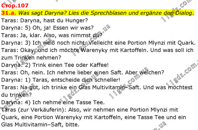 Was sagt Daryna? Lies die Sprechblasen und ergänze den Dialog. Taras: Daryna, hast du Hunger? Daryna: 5) Oh, ja! Essen wir was? Taras: Ja, klar. Also, was nimmst du? Daryna: 3) Ich weiß noch nicht. Vielleicht eine Portion Mlynzi mit Quark. Taras: Okay, und ich möchte Warenyky mit Kartoffeln. Und was soll ich zum Trinken nehmen? Daryna: 2) Trink einen Tee oder Kaffee! Taras: Oh, nein. Ich nehme lieber einen Saft. Aber welchen? Daryna: 1) Taras, entscheide dich schneller! Taras: Na gut, ich trinke ein Glas Multivitamin–Saft. Und was möchtest du trinken? Daryna: 4) Ich nehme eine Tasse Tee. Taras (zur Verkäuferin): Also, wir nehmen eine Portion Mlynzi mit Quark, eine Portion Warenyky mit Kartoffeln, eine Tasse Tee und ein Glas Multivitamin–Saft, bitte.