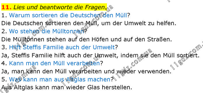 Lies und beantworte die Fragen. 1. Warum sortieren die Deutschen den Müll? Die Deutschen sortieren den Müll, um der Umwelt zu helfen. 2. Wo stehen die Mülltonnen? Die Mülltonnen stehen auf den Höfen und auf den Straßen. 3. Hilft Steffis Familie auch der Umwelt? Ja, Steffis Familie hilft auch der Umwelt, indem sie den Müll sortiert. 4. Kann man den Müll verarbeiten? Ja, man kann den Müll verarbeiten und wieder verwenden. 5. Was kann man aus Altglas machen? Aus Altglas kann man wieder Glas herstellen.