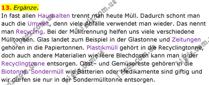 Ergänze. In fast allen Haushalten trennt man heute Müll. Dadurch schont man auch die Umwelt, denn viele Abfälle verwendet man wieder. Das nennt man Recycling. Bei der Mülltrennung helfen uns viele verschiedene Mülltonnen. Glas landet zum Beispiel in der Glastonne und Zeitungen gehören in die Papiertonnen. Plastikmüll gehört in die Recyclingtonne, doch auch andere Materialien wie leere Blechdosen kann man in der Recyclingtonne entsorgen. Obst– und Gemüsereste gehören in die Biotonne. Sondermüll wie Batterien oder Medikamente sind giftig und wir dürfen sie nur in der Sondermülltonne entsorgen.