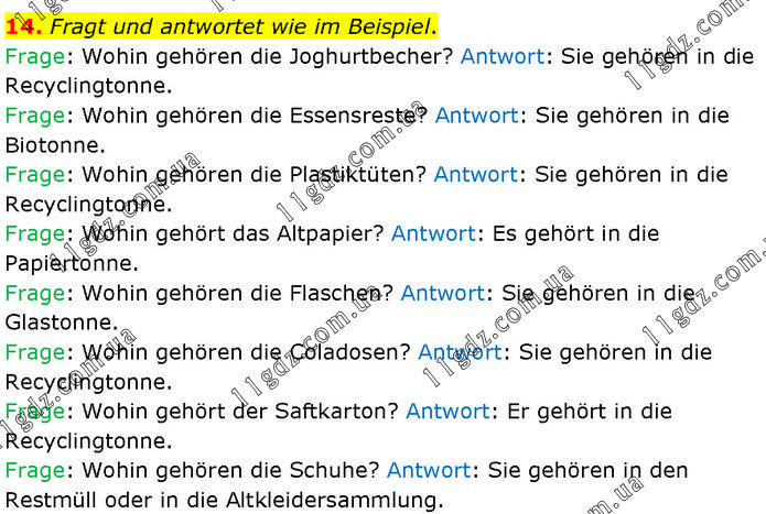 Fragt und antwortet wie im Beispiel. Frage: Wohin gehören die Joghurtbecher? Antwort: Sie gehören in die Recyclingtonne. Frage: Wohin gehören die Essensreste? Antwort: Sie gehören in die Biotonne. Frage: Wohin gehören die Plastiktüten? Antwort: Sie gehören in die Recyclingtonne. Frage: Wohin gehört das Altpapier? Antwort: Es gehört in die Papiertonne. Frage: Wohin gehören die Flaschen? Antwort: Sie gehören in die Glastonne. Frage: Wohin gehören die Coladosen? Antwort: Sie gehören in die Recyclingtonne. Frage: Wohin gehört der Saftkarton? Antwort: Er gehört in die Recyclingtonne. Frage: Wohin gehören die Schuhe? Antwort: Sie gehören in den Restmüll oder in die Altkleidersammlung.