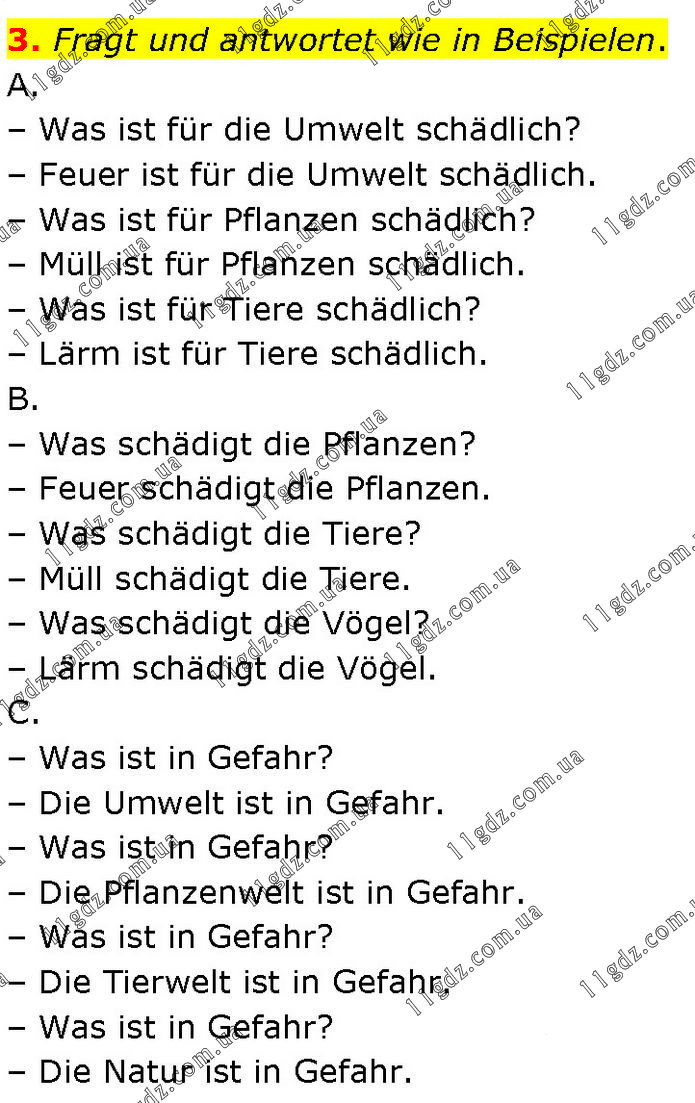 Fragt und antwortet wie in Beispielen. A. – Was ist für die Umwelt schädlich? – Feuer ist für die Umwelt schädlich. – Was ist für Pflanzen schädlich? – Müll ist für Pflanzen schädlich. – Was ist für Tiere schädlich? – Lärm ist für Tiere schädlich. B. – Was schädigt die Pflanzen? – Feuer schädigt die Pflanzen. – Was schädigt die Tiere? – Müll schädigt die Tiere. – Was schädigt die Vögel? – Lärm schädigt die Vögel. C. – Was ist in Gefahr? – Die Umwelt ist in Gefahr. – Was ist in Gefahr? – Die Pflanzenwelt ist in Gefahr. – Was ist in Gefahr? – Die Tierwelt ist in Gefahr. – Was ist in Gefahr? – Die Natur ist in Gefahr.