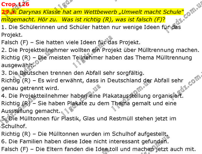 Darynas Klasse hat am Wettbewerb „Umwelt macht Schule“ mitgemacht. Hör zu. Was ist richtig (R), was ist falsch (F)? 1. Die Schülerinnen und Schüler hatten nur wenige Ideen für das Projekt. Falsch (F) – Sie hatten viele Ideen für das Projekt. 2. Die Projektteilnehmer wollten ein Projekt über Mülltrennung machen. Richtig (R) – Die meisten Teilnehmer haben das Thema Mülltrennung ausgewählt. 3. Die Deutschen trennen den Abfall sehr sorgfältig. Richtig (R) – Es wird erwähnt, dass in Deutschland der Abfall sehr genau getrennt wird. 4. Die Projektteilnehmer haben eine Plakatausstellung organisiert. Richtig (R) – Sie haben Plakate zu dem Thema gemalt und eine Ausstellung gemacht. 5. Die Mülltonnen für Plastik, Glas und Restmüll stehen jetzt im Schulhof. Richtig (R) – Die Mülltonnen wurden im Schulhof aufgestellt. 6. Die Familien haben diese Idee nicht interessant gefunden. Falsch (F) – Die Eltern fanden die Idee toll und machen jetzt auch mit.