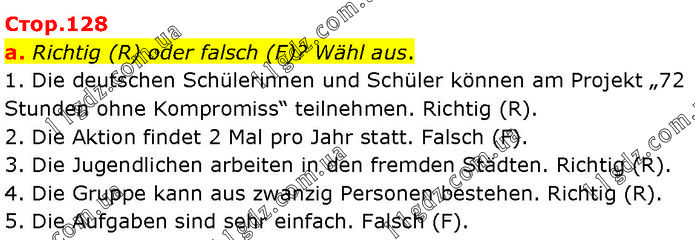 Richtig (R) oder falsch (F)? Wähl aus. 1. Die deutschen Schülerinnen und Schüler können am Projekt „72 Stunden ohne Kompromiss“ teilnehmen. Richtig (R). 2. Die Aktion findet 2 Mal pro Jahr statt. Falsch (F). 3. Die Jugendlichen arbeiten in den fremden Städten. Richtig (R). 4. Die Gruppe kann aus zwanzig Personen bestehen. Richtig (R). 5. Die Aufgaben sind sehr einfach. Falsch (F).