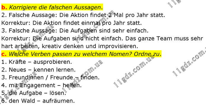 b. Korrigiere die falschen Aussagen. 2. Falsche Aussage: Die Aktion findet 2 Mal pro Jahr statt. Korrektur: Die Aktion findet einmal pro Jahr statt. 3. Falsche Aussage: Die Aufgaben sind sehr einfach. Korrektur: Die Aufgaben sind nicht einfach. Das ganze Team muss sehr hart arbeiten, kreativ denken und improvisieren. c. Welche Verben passen zu welchem Nomen? Ordne zu. 1. Kräfte – ausprobieren. 2. Neues – kennen lernen. 3. Freundinnen / Freunde – finden. 4. mit Engagement – helfen. 5. die Aufgabe – lösen. 6. den Wald – aufräumen.
