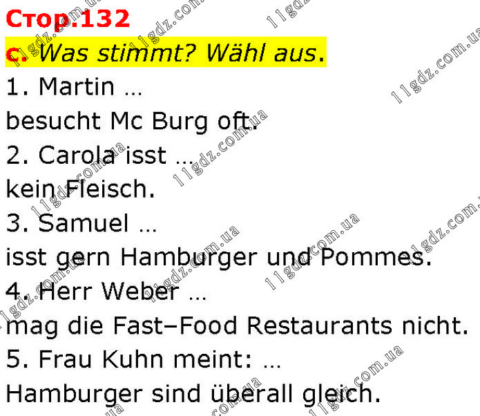 Was stimmt? Wähl aus. 1. Martin … besucht Mc Burg oft. 2. Carola isst … kein Fleisch. 3. Samuel … isst gern Hamburger und Pommes. 4. Herr Weber … mag die Fast–Food Restaurants nicht. 5. Frau Kuhn meint: … Hamburger sind überall gleich.