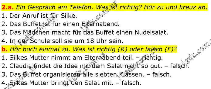 a. Ein Gespräch am Telefon. Was ist richtig? Hör zu und kreuz an. 1. Der Anruf ist für Silke. 2. Das Buffet ist für einen Elternabend. 3. Das Mädchen macht für das Buffet einen Nudelsalat. 4. In der Schule soll sie um 18 Uhr sein. b. Hör noch einmal zu. Was ist richtig (R) oder falsch (F)? 1. Silkes Mutter nimmt am Elternabend teil. – richtig. 2. Claudia findet die Idee mit dem Salat nicht so gut. – falsch. 3. Das Buffet organisieren alle siebten Klassen. – falsch. 4. Silkes Mutter bringt den Salat mit. – falsch.