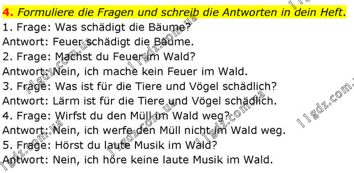 Formuliere die Fragen und schreib die Antworten in dein Heft. 1. Frage: Was schädigt die Bäume? Antwort: Feuer schädigt die Bäume. 2. Frage: Machst du Feuer im Wald? Antwort: Nein, ich mache kein Feuer im Wald. 3. Frage: Was ist für die Tiere und Vögel schädlich? Antwort: Lärm ist für die Tiere und Vögel schädlich. 4. Frage: Wirfst du den Müll im Wald weg? Antwort: Nein, ich werfe den Müll nicht im Wald weg. 5. Frage: Hörst du laute Musik im Wald? Antwort: Nein, ich höre keine laute Musik im Wald.