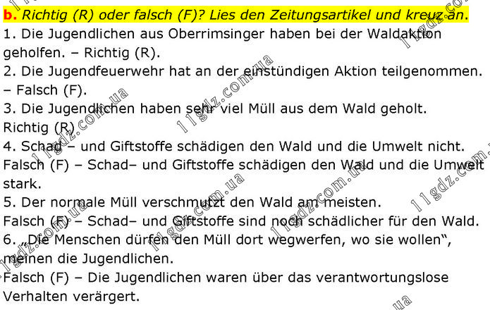 Richtig (R) oder falsch (F)? Lies den Zeitungsartikel und kreuz an. 1. Die Jugendlichen aus Oberrimsinger haben bei der Waldaktion geholfen. – Richtig (R). 2. Die Jugendfeuerwehr hat an der einstündigen Aktion teilgenommen. – Falsch (F). 3. Die Jugendlichen haben sehr viel Müll aus dem Wald geholt. Richtig (R) 4. Schad – und Giftstoffe schädigen den Wald und die Umwelt nicht. Falsch (F) – Schad– und Giftstoffe schädigen den Wald und die Umwelt stark. 5. Der normale Müll verschmutzt den Wald am meisten. Falsch (F) – Schad– und Giftstoffe sind noch schädlicher für den Wald. 6. „Die Menschen dürfen den Müll dort wegwerfen, wo sie wollen“, meinen die Jugendlichen. Falsch (F) – Die Jugendlichen waren über das verantwortungslose Verhalten verärgert.