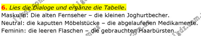 Lies die Dialoge und ergänze die Tabelle. Maskulin: Die alten Fernseher – die kleinen Joghurtbecher. Neutral: die kaputten Möbelstücke – die abgelaufenen Medikamente. Feminin: die leeren Flaschen – die gebrauchten Haarbürsten.