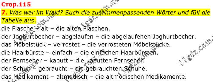 Was war im Wald? Such die zusammenpassenden Wörter und füll die Tabelle aus. die Flasche – alt – die alten Flaschen. der Joghurtbecher – abgelaufen – die abgelaufenen Joghurtbecher. das Möbelstück – verrostet – die verrosteten Möbelstücke. die Haarbürste – einfach – die einfachen Haarbürsten. der Fernseher – kaputt – die kaputten Fernseher. der Schuh – gebraucht – die gebrauchten Schuhe. das Medikament – altmodisch – die altmodischen Medikamente.