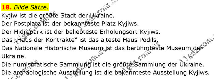 Bilde Sätze. Kyjiw ist die größte Stadt der Ukraine. Der Postplatz ist der bekannteste Platz Kyjiws. Der Hidropark ist der beliebteste Erholungsort Kyjiws. Das „Haus der Kontrakte“ ist das älteste Haus Podils. Das Nationale Historische Museum ist das berühmteste Museum der Ukraine. Die numismatische Sammlung ist die größte Sammlung der Ukraine. Die archäologische Ausstellung ist die bekannteste Ausstellung Kyjiws.