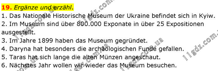 Ergänze und erzähl. 1. Das Nationale Historische Museum der Ukraine befindet sich in Kyiw. 2. Im Museum sind über 800.000 Exponate in über 25 Expositionen ausgestellt. 3. Im Jahre 1899 haben das Museum gegründet. 4. Daryna hat besonders die archäologischen Funde gefallen. 5. Taras hat sich lange die alten Münzen angeschaut. 6. Nächstes Jahr wollen wir wieder das Museum besuchen.