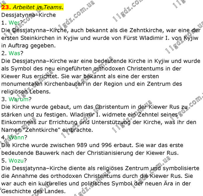 Arbeitet in Teams. Dessjatynna–Kirche 1. Wer? Die Dessjatynna–Kirche, auch bekannt als die Zehntkirche, war eine der ersten Steinkirchen in Kyjiw und wurde von Fürst Wladimir I. von Kyjiw in Auftrag gegeben. 2. Was? Die Dessjatynna–Kirche war eine bedeutende Kirche in Kyjiw und wurde als Symbol des neu eingeführten orthodoxen Christentums in der Kiewer Rus errichtet. Sie war bekannt als eine der ersten monumentalen Kirchenbauten in der Region und ein Zentrum des religiösen Lebens. 3. Warum? Die Kirche wurde gebaut, um das Christentum in der Kiewer Rus zu stärken und zu festigen. Wladimir I. widmete ein Zehntel seines Einkommens zur Errichtung und Unterstützung der Kirche, was ihr den Namen "Zehntkirche" einbrachte. 4. Wann? Die Kirche wurde zwischen 989 und 996 erbaut. Sie war das erste bedeutende Bauwerk nach der Christianisierung der Kiewer Rus. 5. Wozu? Die Dessjatynna–Kirche diente als religiöses Zentrum und symbolisierte die Annahme des orthodoxen Christentums durch die Kiewer Rus. Sie war auch ein kulturelles und politisches Symbol der neuen Ära in der Geschichte des Landes.