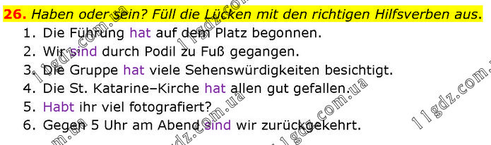 Haben oder sein? Füll die Lücken mit den richtigen Hilfsverben aus. 1. Die Führung hat auf dem Platz begonnen. 2. Wir sind durch Podil zu Fuß gegangen. 3. Die Gruppe hat viele Sehenswürdigkeiten besichtigt. 4. Die St. Katarine–Kirche hat allen gut gefallen. 5. Habt ihr viel fotografiert? 6. Gegen 5 Uhr am Abend sind wir zurückgekehrt.