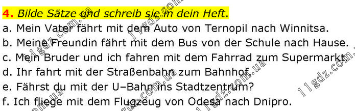 Bilde Sätze und schreib sie in dein Heft. a. Mein Vater fährt mit dem Auto von Ternopil nach Winnitsa. b. Meine Freundin fährt mit dem Bus von der Schule nach Hause. c. Mein Bruder und ich fahren mit dem Fahrrad zum Supermarkt. d. Ihr fahrt mit der Straßenbahn zum Bahnhof. e. Fährst du mit der U–Bahn ins Stadtzentrum? f. Ich fliege mit dem Flugzeug von Odesa nach Dnipro.