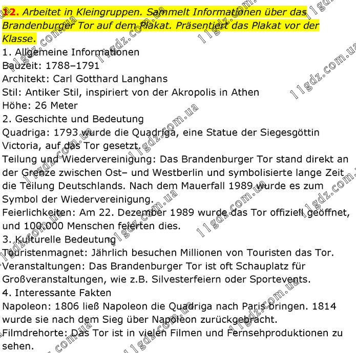 Arbeitet in Kleingruppen. Sammelt Informationen über das Brandenburger Tor auf dem Plakat. Präsentiert das Plakat vor der Klasse. 1. Allgemeine Informationen Bauzeit: 1788–1791 Architekt: Carl Gotthard Langhans Stil: Antiker Stil, inspiriert von der Akropolis in Athen Höhe: 26 Meter. 2. Geschichte und Bedeutung Quadriga: 1793 wurde die Quadriga, eine Statue der Siegesgöttin Victoria, auf das Tor gesetzt. Teilung und Wiedervereinigung: Das Brandenburger Tor stand direkt an der Grenze zwischen Ost– und Westberlin und symbolisierte lange Zeit die Teilung Deutschlands. Nach dem Mauerfall 1989 wurde es zum Symbol der Wiedervereinigung. Feierlichkeiten: Am 22. Dezember 1989 wurde das Tor offiziell geöffnet, und 100.000 Menschen feierten dies. 3. Kulturelle Bedeutung Touristenmagnet: Jährlich besuchen Millionen von Touristen das Tor. Veranstaltungen: Das Brandenburger Tor ist oft Schauplatz für Großveranstaltungen, wie z.B. Silvesterfeiern oder Sportevents. 4. Interessante Fakten Napoleon: 1806 ließ Napoleon die Quadriga nach Paris bringen. 1814 wurde sie nach dem Sieg über Napoleon zurückgebracht. Filmdrehorte: Das Tor ist in vielen Filmen und Fernsehproduktionen zu sehen.