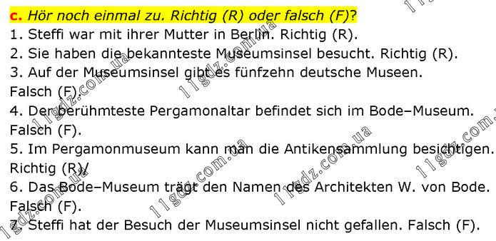 Hör noch einmal zu. Richtig (R) oder falsch (F)? 1. Steffi war mit ihrer Mutter in Berlin. Richtig (R). 2. Sie haben die bekannteste Museumsinsel besucht. Richtig (R). 3. Auf der Museumsinsel gibt es fünfzehn deutsche Museen. Falsch (F). 4. Der berühmteste Pergamonaltar befindet sich im Bode–Museum. Falsch (F). 5. Im Pergamonmuseum kann man die Antikensammlung besichtigen. Richtig (R). 6. Das Bode–Museum trägt den Namen des Architekten W. von Bode. Falsch (F). 7. Steffi hat der Besuch der Museumsinsel nicht gefallen. Falsch (F).