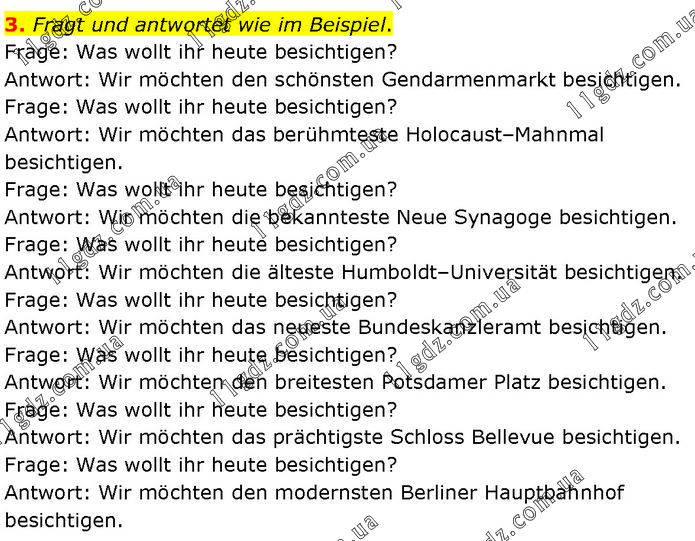 Fragt und antwortet wie im Beispiel. Frage: Was wollt ihr heute besichtigen? Antwort: Wir möchten den schönsten Gendarmenmarkt besichtigen. Frage: Was wollt ihr heute besichtigen? Antwort: Wir möchten das berühmteste Holocaust–Mahnmal besichtigen. Frage: Was wollt ihr heute besichtigen? Antwort: Wir möchten die bekannteste Neue Synagoge besichtigen. Frage: Was wollt ihr heute besichtigen? Antwort: Wir möchten die älteste Humboldt–Universität besichtigen. Frage: Was wollt ihr heute besichtigen? Antwort: Wir möchten das neueste Bundeskanzleramt besichtigen. Frage: Was wollt ihr heute besichtigen? Antwort: Wir möchten den breitesten Potsdamer Platz besichtigen. Frage: Was wollt ihr heute besichtigen? Antwort: Wir möchten das prächtigste Schloss Bellevue besichtigen. Frage: Was wollt ihr heute besichtigen? Antwort: Wir möchten den modernsten Berliner Hauptbahnhof besichtigen.