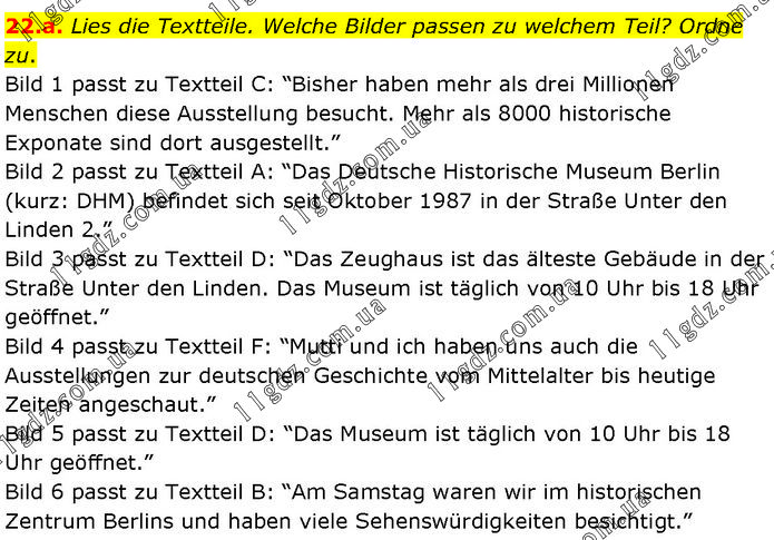 Lies die Textteile. Welche Bilder passen zu welchem Teil? Ordne zu. Bild 1 passt zu Textteil C: “Bisher haben mehr als drei Millionen Menschen diese Ausstellung besucht. Mehr als 8000 historische Exponate sind dort ausgestellt.” Bild 2 passt zu Textteil A: “Das Deutsche Historische Museum Berlin (kurz: DHM) befindet sich seit Oktober 1987 in der Straße Unter den Linden 2.” Bild 3 passt zu Textteil D: “Das Zeughaus ist das älteste Gebäude in der Straße Unter den Linden. Das Museum ist täglich von 10 Uhr bis 18 Uhr geöffnet.” Bild 4 passt zu Textteil F: “Mutti und ich haben uns auch die Ausstellungen zur deutschen Geschichte vom Mittelalter bis heutige Zeiten angeschaut.” Bild 5 passt zu Textteil D: “Das Museum ist täglich von 10 Uhr bis 18 Uhr geöffnet.” Bild 6 passt zu Textteil B: “Am Samstag waren wir im historischen Zentrum Berlins und haben viele Sehenswürdigkeiten besichtigt.”