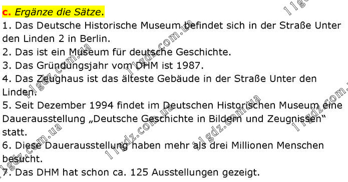 Ergänze die Sätze. 1. Das Deutsche Historische Museum befindet sich in der Straße Unter den Linden 2 in Berlin. 2. Das ist ein Museum für deutsche Geschichte. 3. Das Gründungsjahr vom DHM ist 1987. 4. Das Zeughaus ist das älteste Gebäude in der Straße Unter den Linden. 5. Seit Dezember 1994 findet im Deutschen Historischen Museum eine Dauerausstellung „Deutsche Geschichte in Bildern und Zeugnissen“ statt. 6. Diese Dauerausstellung haben mehr als drei Millionen Menschen besucht. 7. Das DHM hat schon ca. 125 Ausstellungen gezeigt.