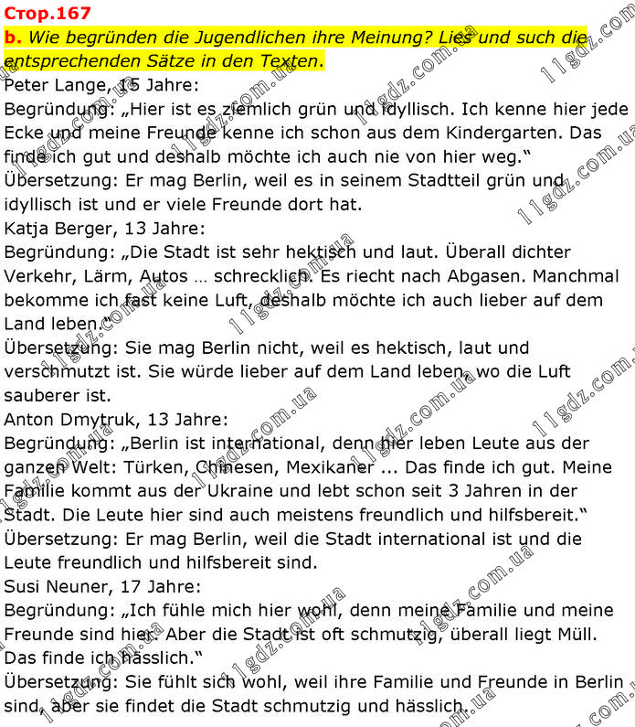 Wie begründen die Jugendlichen ihre Meinung? Lies und such die entsprechenden Sätze in den Texten. Peter Lange, 15 Jahre: Begründung: „Hier ist es ziemlich grün und idyllisch. Ich kenne hier jede Ecke und meine Freunde kenne ich schon aus dem Kindergarten. Das finde ich gut und deshalb möchte ich auch nie von hier weg.“ Übersetzung: Er mag Berlin, weil es in seinem Stadtteil grün und idyllisch ist und er viele Freunde dort hat. Katja Berger, 13 Jahre: Begründung: „Die Stadt ist sehr hektisch und laut. Überall dichter Verkehr, Lärm, Autos … schrecklich. Es riecht nach Abgasen. Manchmal bekomme ich fast keine Luft, deshalb möchte ich auch lieber auf dem Land leben.“ Übersetzung: Sie mag Berlin nicht, weil es hektisch, laut und verschmutzt ist. Sie würde lieber auf dem Land leben, wo die Luft sauberer ist. Anton Dmytruk, 13 Jahre: Begründung: „Berlin ist international, denn hier leben Leute aus der ganzen Welt: Türken, Chinesen, Mexikaner ... Das finde ich gut. Meine Familie kommt aus der Ukraine und lebt schon seit 3 Jahren in der Stadt. Die Leute hier sind auch meistens freundlich und hilfsbereit.“ Übersetzung: Er mag Berlin, weil die Stadt international ist und die Leute freundlich und hilfsbereit sind. Susi Neuner, 17 Jahre: Begründung: „Ich fühle mich hier wohl, denn meine Familie und meine Freunde sind hier. Aber die Stadt ist oft schmutzig, überall liegt Müll. Das finde ich hässlich.“ Übersetzung: Sie fühlt sich wohl, weil ihre Familie und Freunde in Berlin sind, aber sie findet die Stadt schmutzig und hässlich.