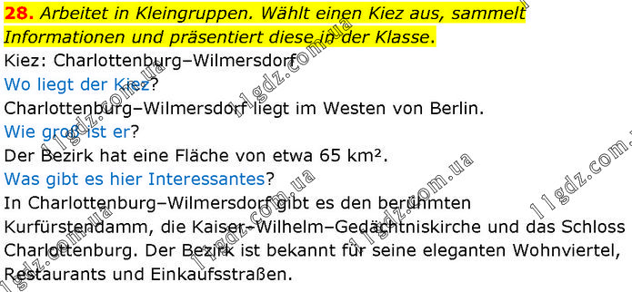 Arbeitet in Kleingruppen. Wählt einen Kiez aus, sammelt Informationen und präsentiert diese in der Klasse. Kiez: Charlottenburg–Wilmersdorf Wo liegt der Kiez? Charlottenburg–Wilmersdorf liegt im Westen von Berlin. Wie groß ist er? Der Bezirk hat eine Fläche von etwa 65 km². Was gibt es hier Interessantes? In Charlottenburg–Wilmersdorf gibt es den berühmten Kurfürstendamm, die Kaiser–Wilhelm–Gedächtniskirche und das Schloss Charlottenburg. Der Bezirk ist bekannt für seine eleganten Wohnviertel, Restaurants und Einkaufsstraßen.