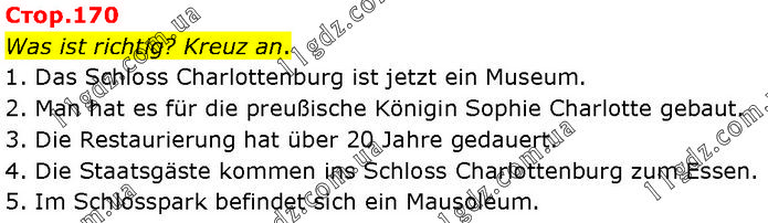 Was ist richtig? Kreuz an. 1. Das Schloss Charlottenburg ist jetzt ein Museum. 2. Man hat es für die preußische Königin Sophie Charlotte gebaut. 3. Die Restaurierung hat über 20 Jahre gedauert. 4. Die Staatsgäste kommen ins Schloss Charlottenburg zum Essen. 5. Im Schlosspark befindet sich ein Mausoleum.
