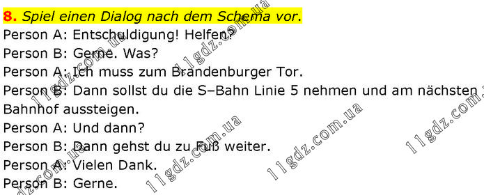 Spiel einen Dialog nach dem Schema vor. Person A: Entschuldigung! Helfen? Person B: Gerne. Was? Person A: Ich muss zum Brandenburger Tor. Person B: Dann sollst du die S–Bahn Linie 5 nehmen und am nächsten Bahnhof aussteigen. Person A: Und dann? Person B: Dann gehst du zu Fuß weiter. Person A: Vielen Dank. Person B: Gerne.