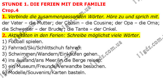 STUNDE 1. DIE FERIEN MIT DER FAMILIE Стор.4 1. Verbinde die zusammenpassenden Wörter. Höre zu und sprich mit. der Vater – die Mutter; der Cousin – die Cousine; der Opa – die Oma; die Schwester – der Bruder; die Tante – der Onkel. 2. Aktivitäten in den Ferien: Schreibe möglichst viele Wörter. 1) Fußball spielen. 2) Fahrrad/Ski/Schlittschuh fahren. 3) Schwimmen/Wandern/Einkaufen gehen. 4) ins Ausland/ans Meer/in die Berge reisen. 5) ein Museum/Freunde/Verwandte besuchen. 6) Modelle/Souvenirs/Karten basteln.