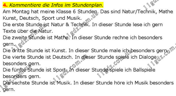 Kommentiere die Infos im Stundenplan. Am Montag hat meine Klasse 6 Stunden. Das sind Natur/Technik, Mathe Kunst, Deutsch, Sport und Musik. Die erste Stunde ist Natur & Technik. In dieser Stunde lese ich gern Texte über die Natur. Die zweite Stunde ist Mathe. In dieser Stunde rechne ich besonders gern. Die dritte Stunde ist Kunst. In dieser Stunde male ich besonders gern. Die vierte Stunde ist Deutsch. In dieser Stunde spiele ich Dialoge besonders gern. Die fünfte Stunde ist Sport. In dieser Stunde spiele ich Ballspiele besonders gern. Die sechste Stunde ist Musik. In dieser Stunde höre ich Musik besonders gern.