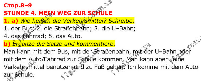 STUNDE 4. MEIN WEG ZUR SCHULE 1. a) Wie heißen die Verkehrsmittel? Schreibe. 1. der Bus; 2. die Straßenbahn; 3. die U–Bahn; 4. das Fahrrad; 5. das Auto. b) Ergänze die Sätze und kommentiere. Man kann mit dem Bus, mit der Straßenbahn, mit der U–Bahn oder mit dem Auto/Fahrrad zur Schule kommen. Man kann aber keine Verkehrsmittel benutzen und zu Fuß gehen. Ich komme mit dem Auto zur Schule.