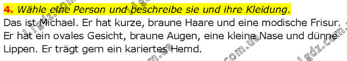 Wähle eine Person und beschreibe sie und ihre Kleidung. Das ist Michael. Er hat kurze, braune Haare und eine modische Frisur. Er hat ein ovales Gesicht, braune Augen, eine kleine Nase und dünne Lippen. Er trägt gern ein kariertes Hemd.