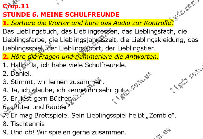 STUNDE 6. MEINE SCHULFREUNDE 1. Sortiere die Wörter und höre das Audio zur Kontrolle. Das Lieblingsbuch, das Lieblingsessen, das Lieblingsfach, die Lieblingsfarbe, die Lieblingsjahreszeit, die Lieblingskleidung, das Lieblingsspiel, der Lieblingssport, der Lieblingstier. 2. Höre die Fragen und nummeriere die Antworten. 1. Hallo! Ja, ich habe viele Schulfreunde. 2. Daniel. 3. Stimmt, wir lernen zusammen. 4. Ja, ich glaube, ich kenne ihn sehr gut. 5. Er liest gern Bücher. 6. „Ritter und Räuber" 7. Er mag Brettspiele. Sein Lieblingsspiel heißt „Zombie". 8. Tischtennis 9. Und ob! Wir spielen gerne zusammen.