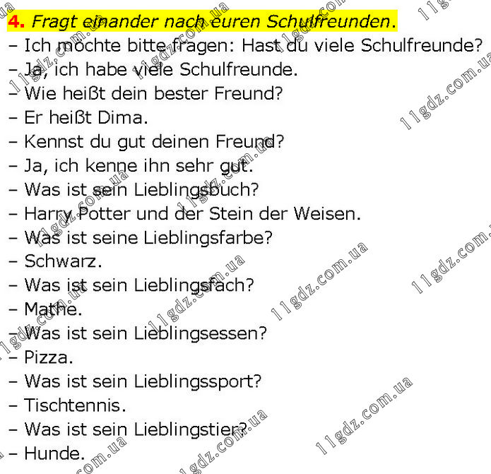 Fragt einander nach euren Schulfreunden. – Ich möchte bitte fragen: Hast du viele Schulfreunde? – Ja, ich habe viele Schulfreunde. – Wie heißt dein bester Freund? – Er heißt Dima. – Kennst du gut deinen Freund? – Ja, ich kenne ihn sehr gut. – Was ist sein Lieblingsbuch? – Harry Potter und der Stein der Weisen. – Was ist seine Lieblingsfarbe? – Schwarz. – Was ist sein Lieblingsfach? – Mathe. – Was ist sein Lieblingsessen? – Pizza. – Was ist sein Lieblingssport? – Tischtennis. – Was ist sein Lieblingstier? – Hunde.
