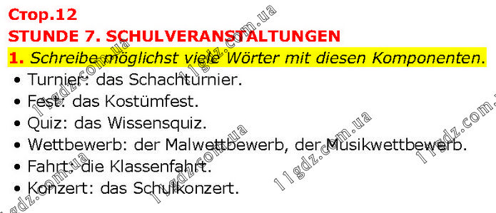 STUNDE 7. SCHULVERANSTALTUNGEN 1. Schreibe möglichst viele Wörter mit diesen Komponenten. • Turnier: das Schachturnier. • Fest: das Kostümfest. • Quiz: das Wissensquiz. • Wettbewerb: der Malwettbewerb, der Musikwettbewerb. • Fahrt: die Klassenfahrt. • Konzert: das Schulkonzert.