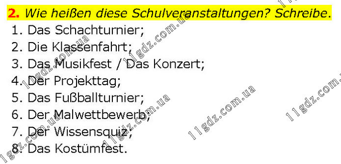 Wie heißen diese Schulveranstaltungen? Schreibe. 1. Das Schachturnier; 2. Die Klassenfahrt; 3. Das Musikfest / Das Konzert; 4. Der Projekttag; 5. Das Fußballturnier; 6. Der Malwettbewerb; 7. Der Wissensquiz; 8. Das Kostümfest.